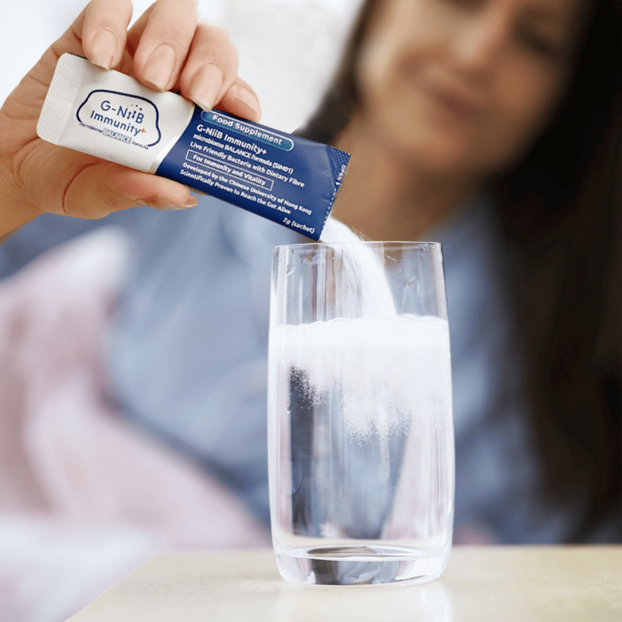 Thanks to our patented micro-encapsulation technology, G-NiiB Immunity+ (SIM01) live-friendly bacteria formula can keep itself in power form sachet yet sustain its potent efficacy.