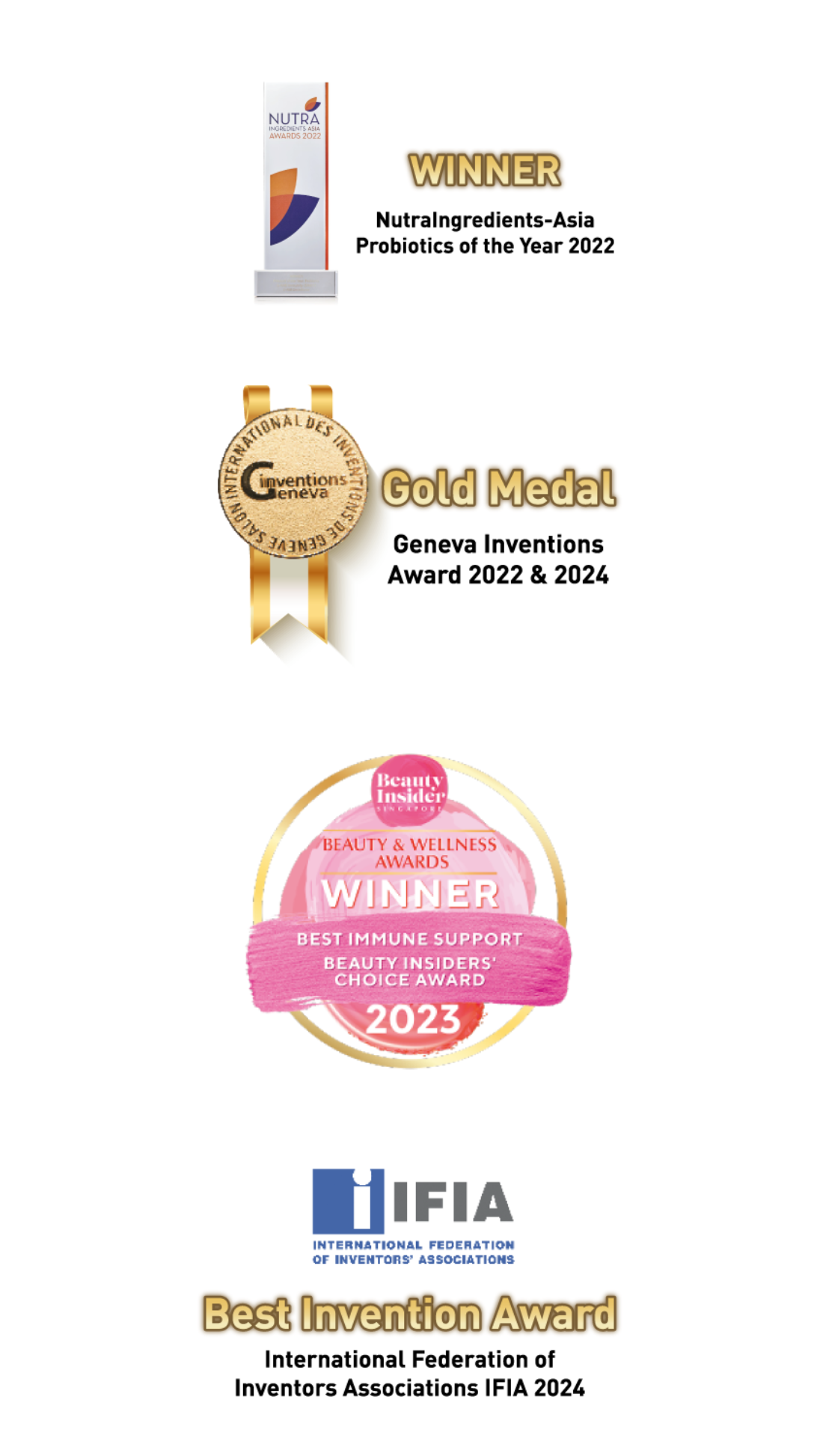 • Gold Medal at the 2024 Geneva International Exhibition of Inventions for our probiotic supplement